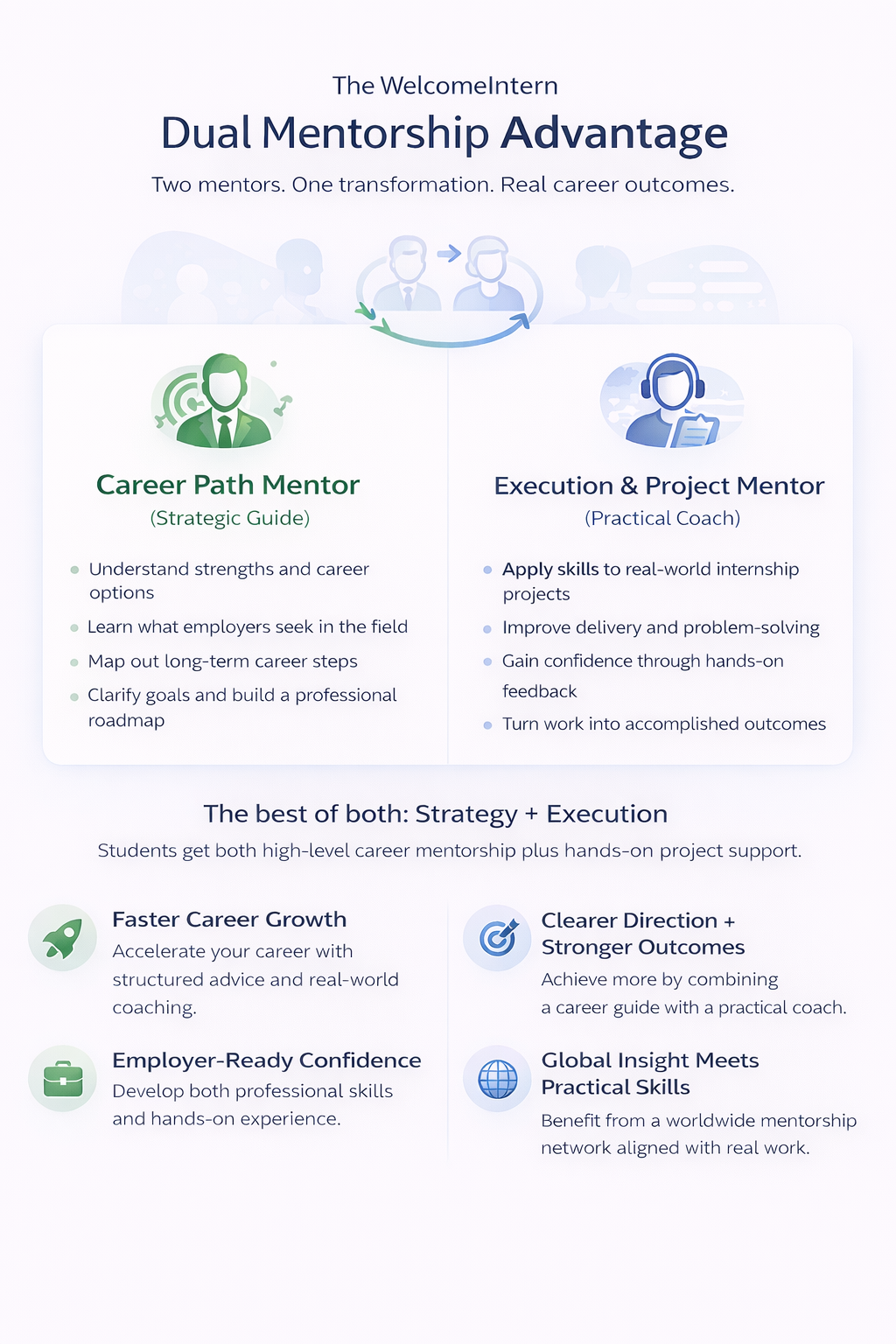 At WelcomeIntern, students don’t just receive guidance from one person — they benefit from a Dual Mentorship Model, designed to provide both strategic direction and real-world execution support.
