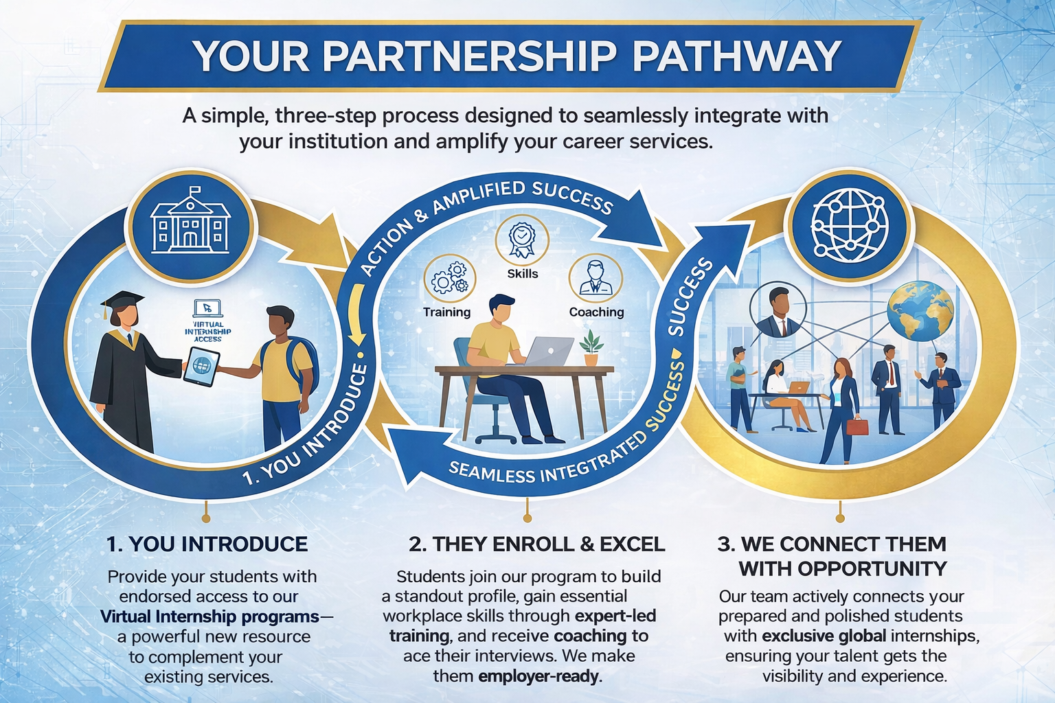 Amplify Your Career Services at No Cost Enhance your career development offerings without impacting your budget. Our partnership model is entirely free for institutions, allowing you to provide a world-class internship program as a powerful, risk-free extension of your existing services.