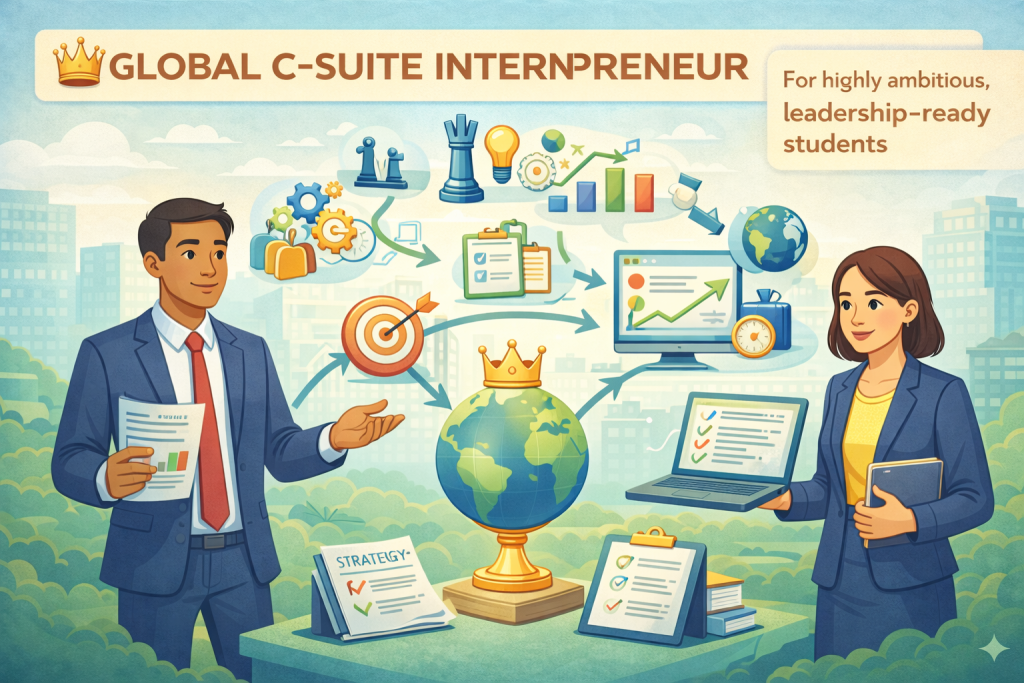The Global C-Suite Internpreneur program is designed for highly ambitious students who are ready to think beyond individual roles and step into leadership mindsets. You’ll gain exposure to strategy, decision-making, accountability, and global business thinking. This pathway helps you develop leadership confidence, ownership, and execution discipline—preparing you for future leadership, entrepreneurial, or high-impact roles. It’s best suited for students who are driven, proactive, and ready to take responsibility for outcomes.