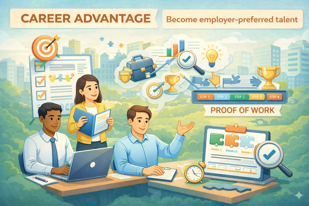 The Career Advantage -Track is a flexible, outcome-focused program for students who want to stand out as employer-preferred talent. It allows you to customize your journey while focusing on measurable results, real exposure, and consistent execution. You’ll build strong proof of work, adapt to real workplace challenges, and gain confidence in handling responsibilities independently. This program is ideal if you want flexibility without compromising on outcomes and career readiness.