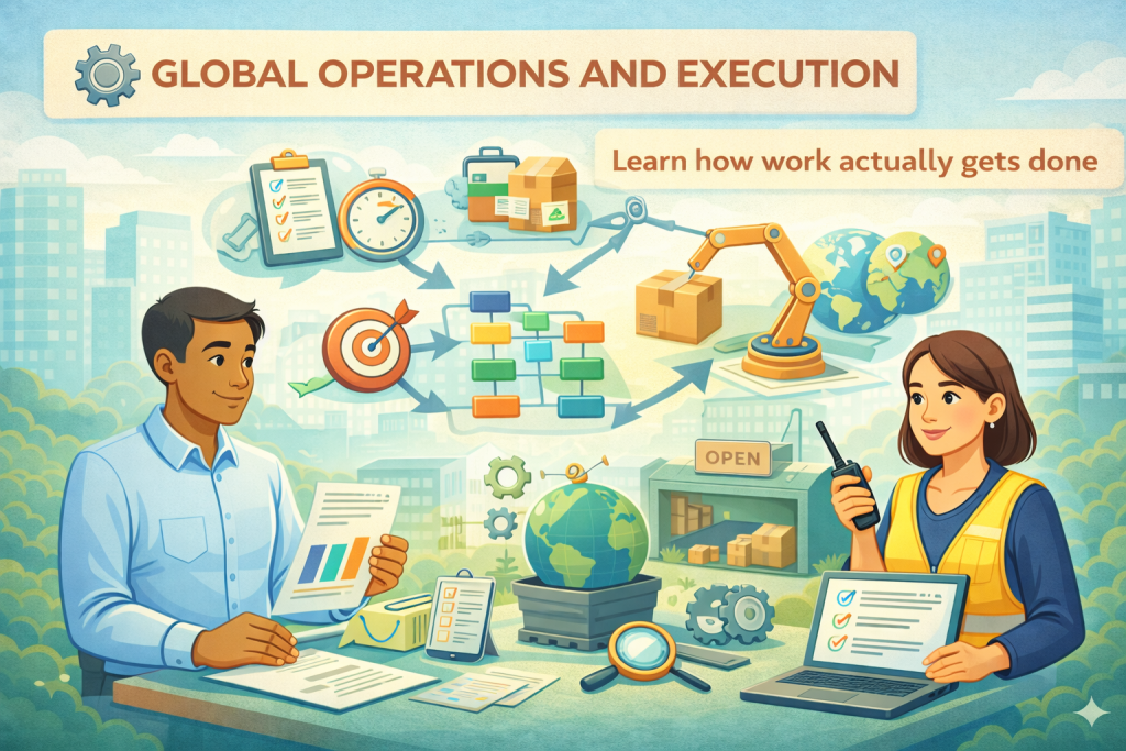 The Global Operations and Execution program helps students understand how real organizations operate behind the scenes. You’ll learn about workflows, coordination, execution discipline, and delivering outcomes consistently. This pathway is ideal for students who want to master execution, reliability, and operational excellence—skills that are crucial but often missing in traditional education. It prepares you to contribute effectively in fast-paced, real-world environments.